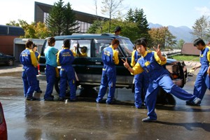 学生に洗車を頼んでおきながら、仕上がりに不満があったらしく”ほら落ちるだろ”などと言いながら結局自分で手を出しております。私は下回り泥だらけですし、本日も汚しに行く予定なので洗車は遠慮しました。