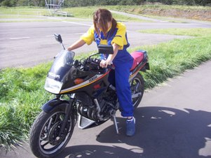 先日、個人的に購入したFZ250PHAZERですが自宅の車庫に車2台とバイク3台、タイヤは30本以上も置く所が無くいっぱいなので学校のガレージにおかせてもらってます。今日の体入スタッフでもあり自動車工学科の紅一点を乗せてみました。小ぶりなバイクで、当時は女の子が乗るバイクといわれていたほどの車体なのですが”ツンツン”です。彼女は普段はShadow400に乗っているなど信じられないでしょうね・・・。今日のスタッフは私を含めて全てバイク乗りでしたが、それぞれの所有車は体格が小さいほうが大きいバイクに乗っているという変な組み合わせでした。