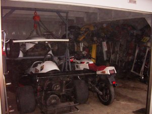 いつも体験入学で試乗してもらっているFC-632ですが普段はガレージでこのように2段で格納されています。そのまま地べたに置いておくと薄っぺらい車ばかりなので数が置けないので、門型のクレーンを製作して吊り上げてその下にノーズをもぐりこませてあります。レーシングカートも縦のスタンドを製作して立てており9台格納してあります。バイクも3台入っております。自動車2台分のスペースにこれだけ入れてまだカート5台とバイク1台くらいは入りそうです。