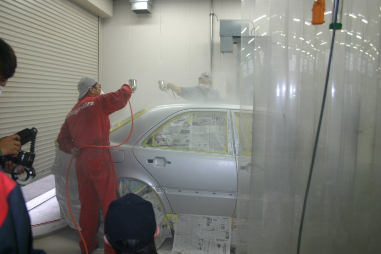 実習棟の向こう側ではAMの取材で全塗装中。こっちのトラックのボデーの仕上げですか?一応看板は削り落としました。質実剛健な作業用ですが何か?